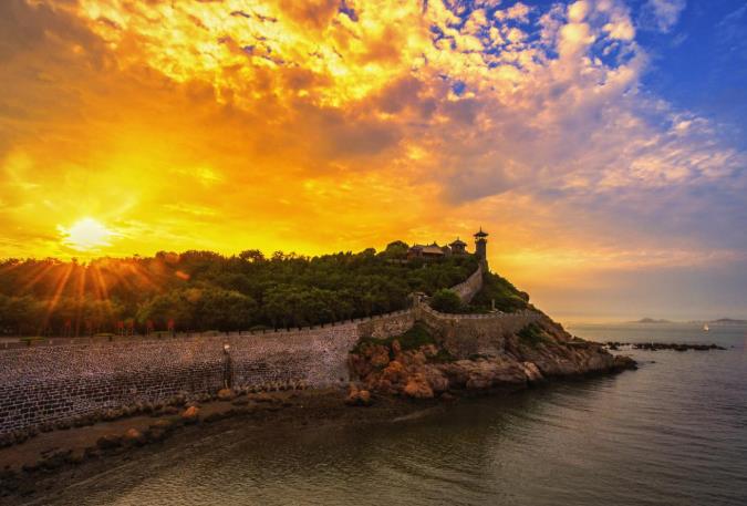 刘公岛,国家AAAAA级景区,位于⼭东半岛最东端的威海湾内,⼈⽂景观丰富独特,既有上溯千年的战国遗址、汉代刘公刘⺟的美丽传说,⼜有清朝北洋海军提督署、⽔师学堂、古炮台等甲午战争遗址,还有众多英租时期遗留下来的欧式建筑,素有“东隅屏藩”和“不沉的战舰”之称。